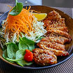 Flaky salmon fillet glazed with a sweet and savory teriyaki sauce, accompanied by steamed rice and seasonal stir-fried vegetables.